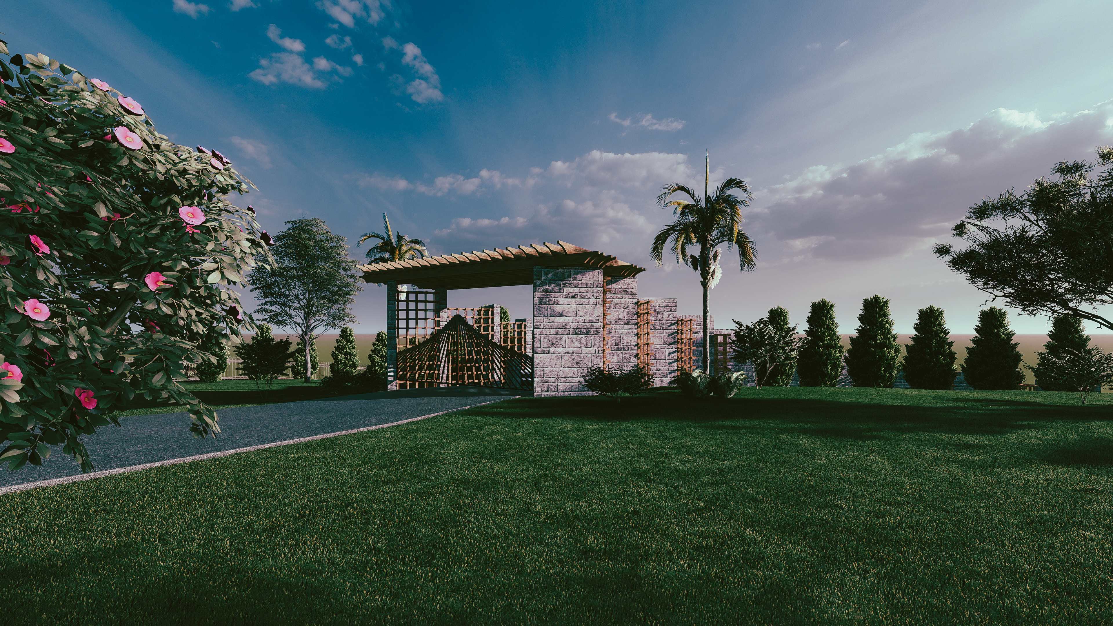 Elegant stone pillars with pergola structure, flowering shrubs, palm trees, and manicured lawns create a welcoming arrival experience.